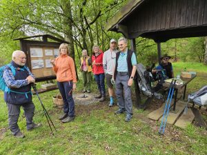 Ein kurzer Anstieg brachte uns zu einem Gedenkstein, der an die „Schlacht von Kircheib“ erinnerte, die hier vor genau 230 Jahren im Rahmen der „Koalitionskriege“ zwischen dem Deutschen Reich und den französischen Revolutionstruppen stattgefunden hat. Aber schon bald wurde es wieder friedlich. Wir überquerten die B 8 und wanderten mit schönen Aussichten in das Bergische Land zurück nach Uckerath. Insgesamt bewältigten wir 15,2 km und 210 Höhenmeter. Die An- und Abstiege waren mit jeweils unter 10 % sehr sanft und knieschonend.