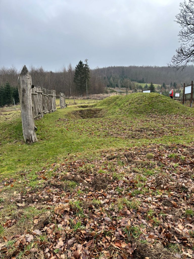 Nach einem recht steilen Anstieg von 50 Höhenmetern standen wir vor einem restaurierten Stück des Limes mit zahlreichen Hinweistafeln. Auch die gut erhaltenen Steinfundamente zweier Limestürme gab es dort zu sehen.